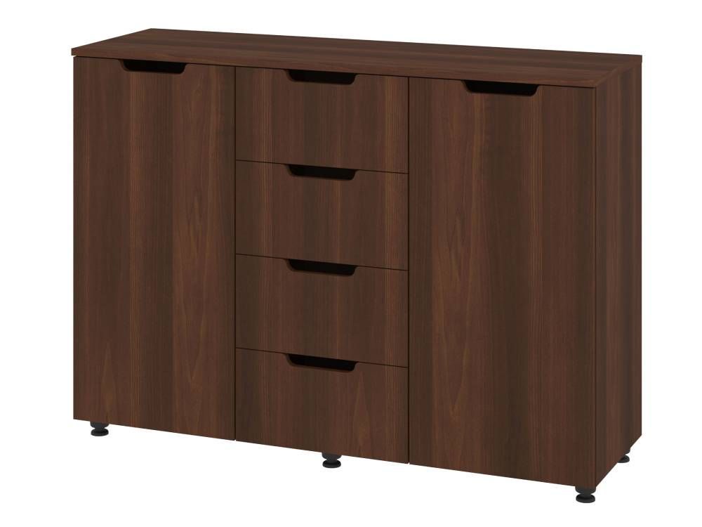 Конструкция комода предусматривает две тумбы по бокам, пространство которых внутри разделено полкой. Высота полок позволит поставить объемные и высокие вещи, папки, различные принадлежности или посуду в коробках. В центре комода размещено четыре выдвижных ящика на телескопических направляющих, которые работают плавно и бесшумно, предоставляя полный доступ к содержимому.