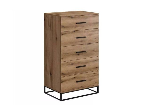 Данная модель состоит из пяти выдвижных ящиков на телескопических направляющих. Комод высокий и узкий, занимает немного место, при этом достаточно вместителен, позволит хранить значительное количество вещей. Он универсален и практичен, в его ящиках вы сможете хранить одежду, аксессуары, документы, различные гаджеты и многое другое. Конструкционная особенность данной модели - цельносварная металлическая основа, на которой стоит комод. Такой прием позволяет визуально облегчить конструкцию, а также оставляет свободный доступ для уборки. Фасады ящиков дополнены узкими ручками, поддерживая общий стиль комода.