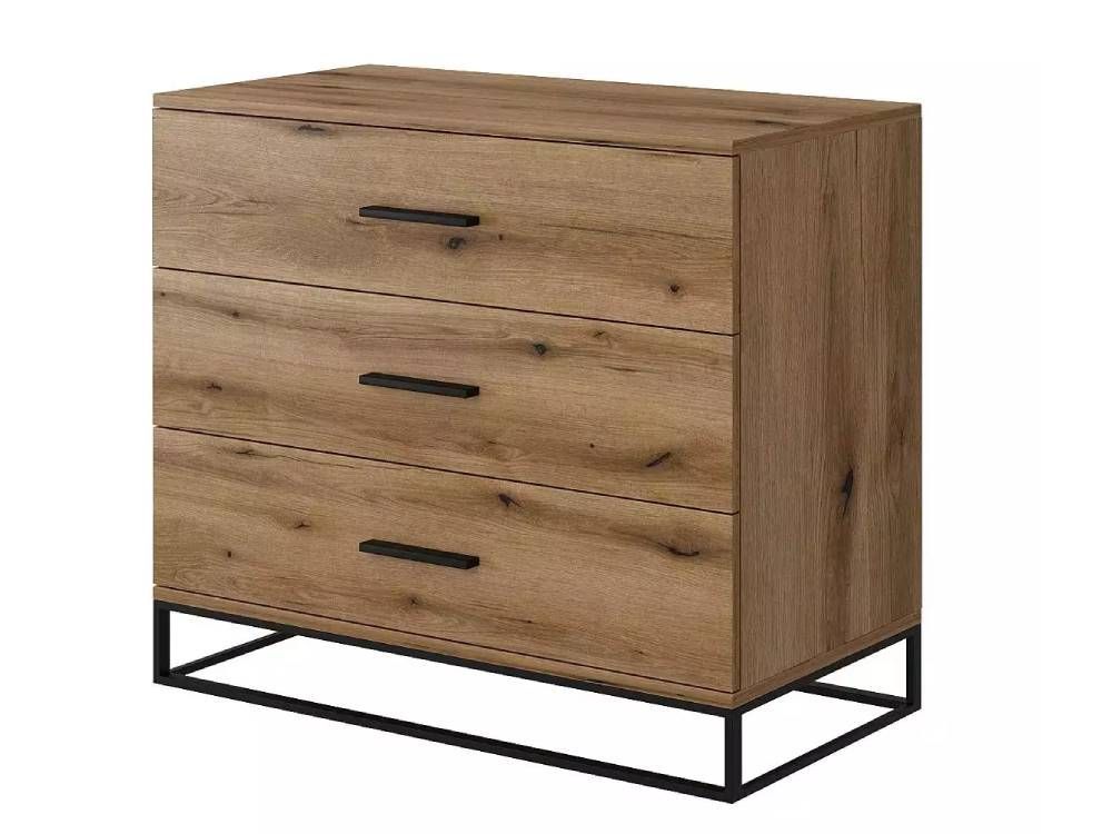 Данная модель состоит из трех выдвижных ящиков, что удобно и практично для хранения различных вещей, в зависимости от комнаты в который вы разместите комод. В спальне - это может быть одежда для быстрого доступа под рукой, в гостиной - документы, различные аксессуары, бытовые мелочи. Конструкционная особенность комода - металлическое основание, которое придает устойчивости и надежности, а также оставляет свободное пространство для уборки. Фасады ящиков дополнены узкими ручками, поддерживая общий стиль комода.