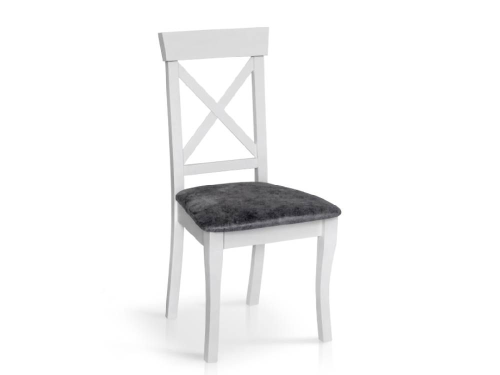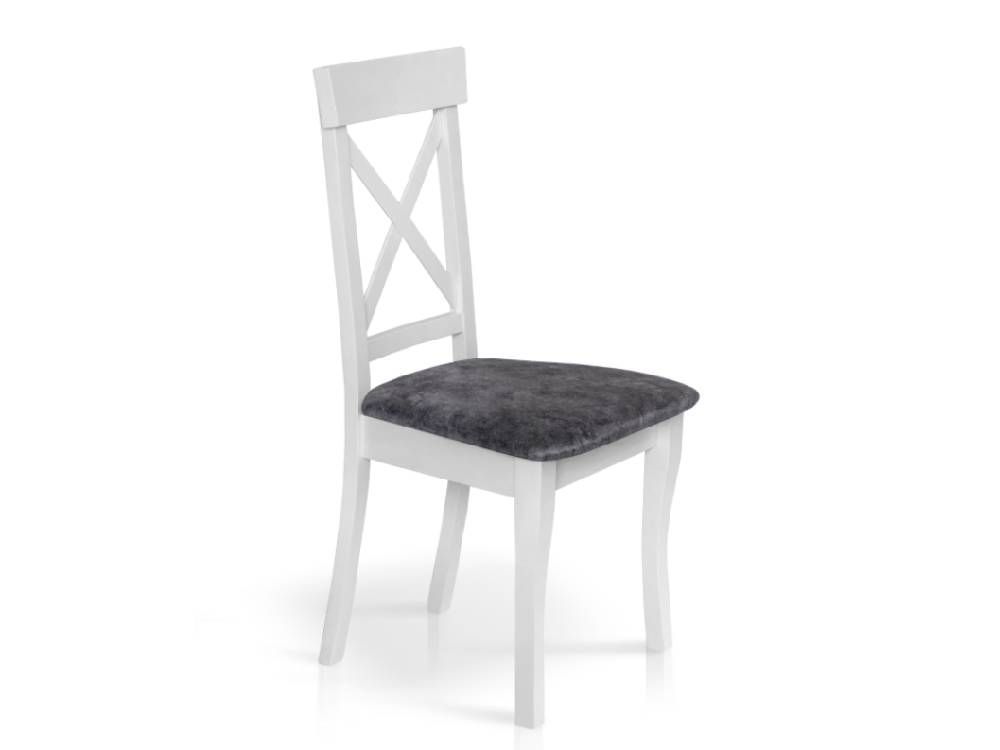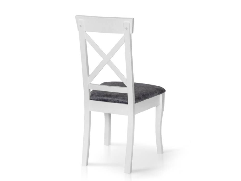 Данная модель стула выделяется не только красивым внешним видом, но и удобством. Спинка стула высокая и представлена в виде двух скрещенных планок, которые создают опору для спины и придают жесткость конструкции. Сиденье стула глубокое и мягкое, в качестве обивки используется качественная ткань серого цвета. Сочетание белого каркаса и серого сиденья выглядит эффектно и конечно же освежит интерьер комнаты.