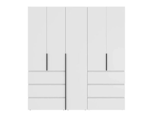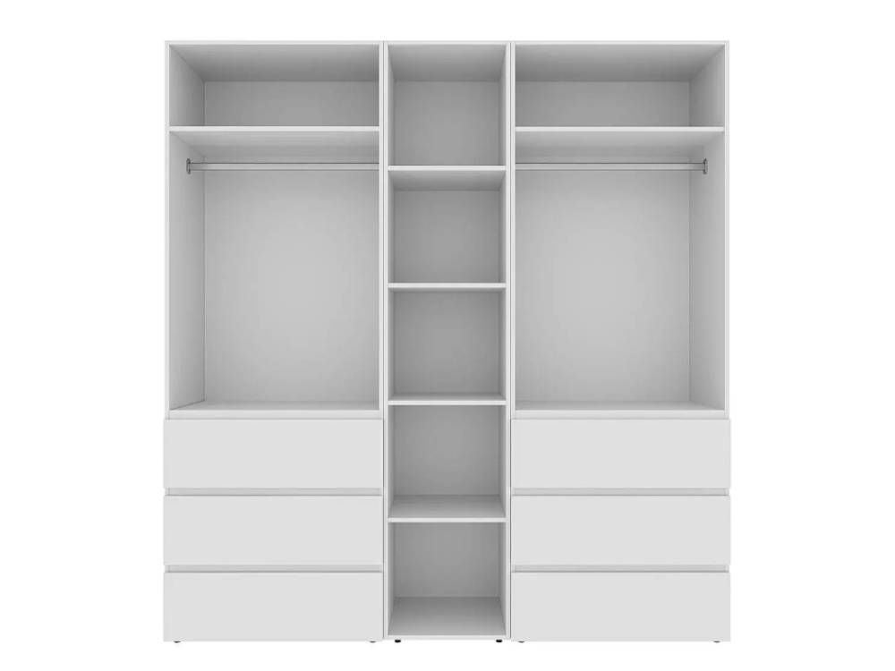 Конструкция данной модели представляет собой комбинацию таких элементов серии: два шкафа двухдверных с ящиками Light 2 и пенал закрытый с полками Light 1, которые соединяются между собой с помощью специальных болтов. Такая комбинация станет отличным выбором, например для семейной пары - у каждого свое отделение с штангой и выдвижными ящиками для хранения вещий, которые вам нужны в быстром доступе, а посередине размещено отделение с полками, которое позволит разместить значительное количество вещей. Высота данной модели шкафа составляет 220 см, что даст возможность с пользой использовать пространство комнаты, при этом визуально шкаф выглядит компактно.