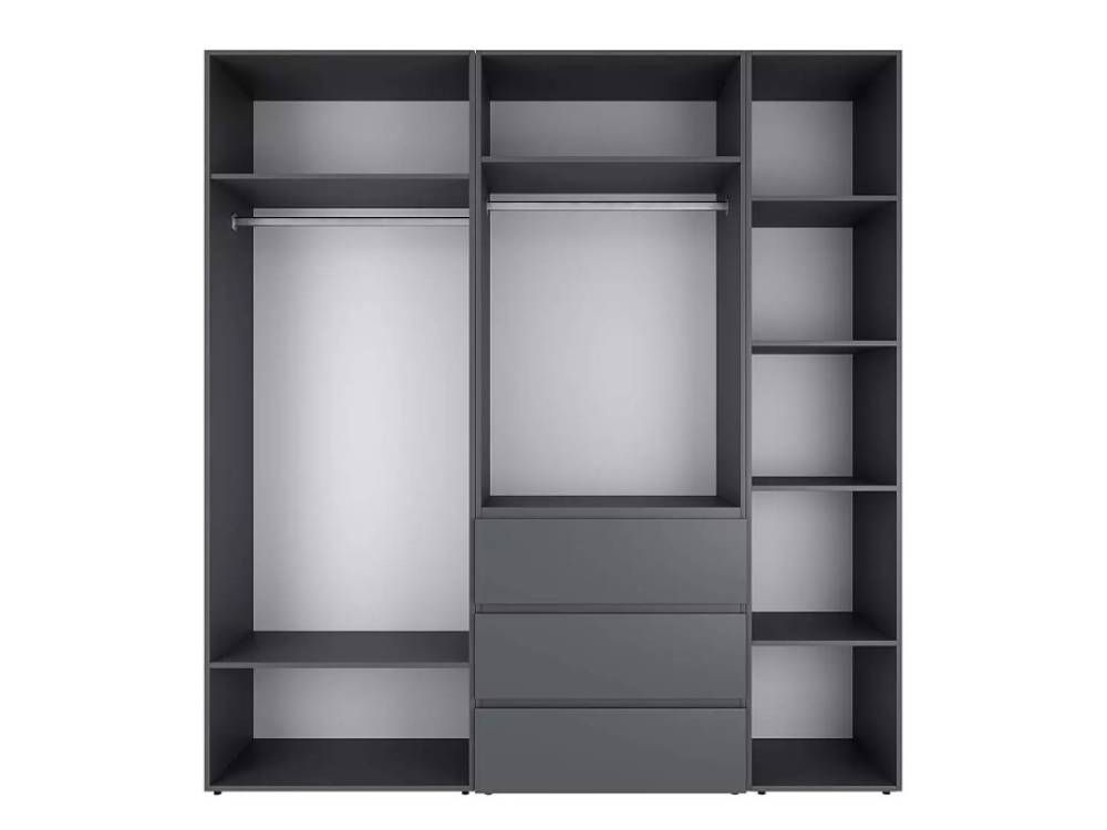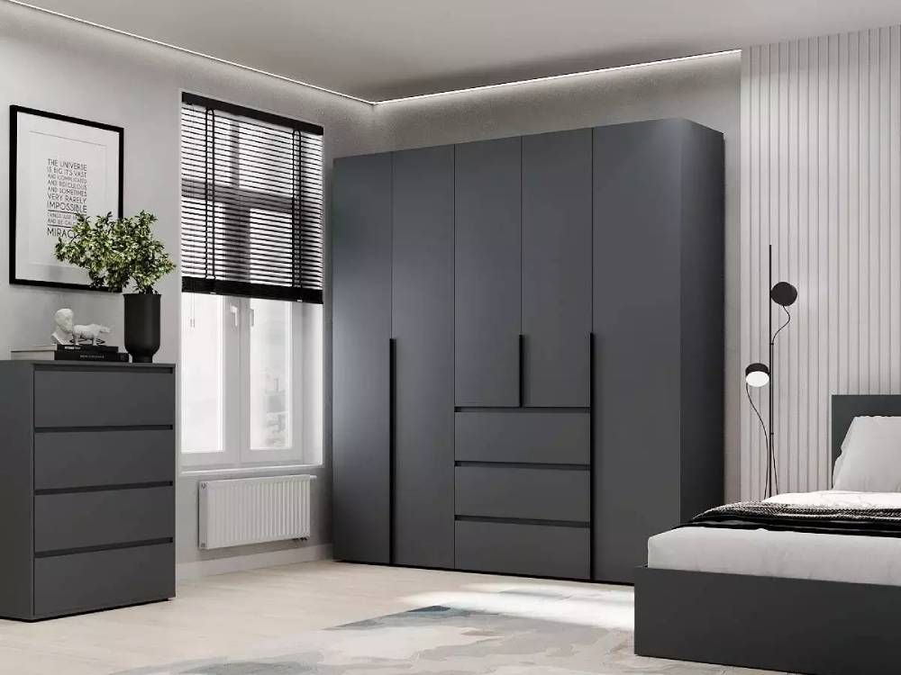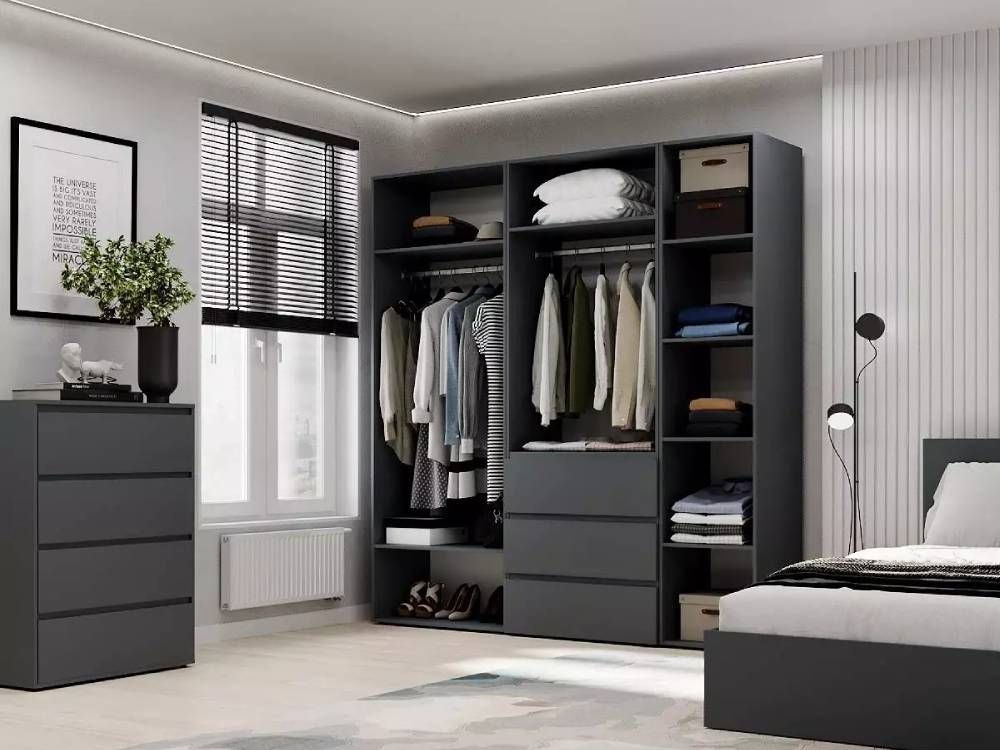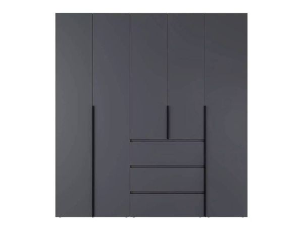 Конструкция данной модели представляет собой комбинацию таких элементов серии: шкаф двухдверный Light 1, шкаф двухдверный с ящиками Light 2 и пенал закрытый с полками Light 1, которые соединяются между собой с помощью специальных болтов. Такое сочетание отделений предоставляет значительное пространство для хранения одежды, аксессуаров, обуви. В вашем распоряжении два вместительных отделения с штангой для одежды, три выдвижных ящика для удобства хранения повседневной одежды и белья, а также отделение с полками. Высота данной модели шкафа составляет 220 см, позволяя вам использовать все доступное пространство, верхние полки удобно использовать для хранения сезонной одежды.