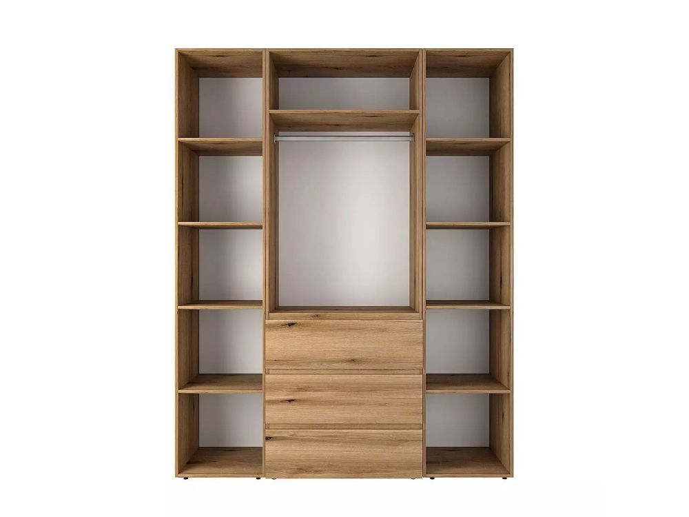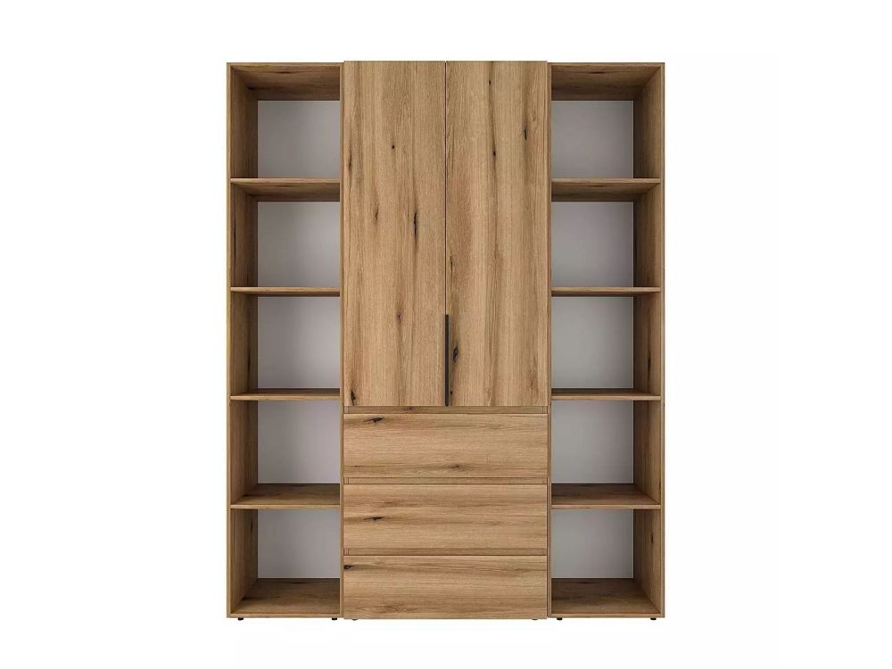 Конструкция данной модели представляет собой комбинацию таких элементов серии: шкаф двухдверный с ящиками Light 2 и два пенала открытых с полками Light, которые соединяются между собой с помощью специальных болтов. Такое сочетание прекрасный выбор для размещения вещей для одного. Центральное отделение оснащено штангой для одежды, верхней полкой и тремя выдвижными ящиками для ежедневной одежды. По бокам размещены пеналы с открытыми полками, удобными чтобы расставить книги, элементы декора, учебные материалы, органайзеры для различных принадлежностей необходимых под рукой. Несмотря на большую высоту, которая составляет 220 см, шкаф выглядит легко и не перегружает пространство.