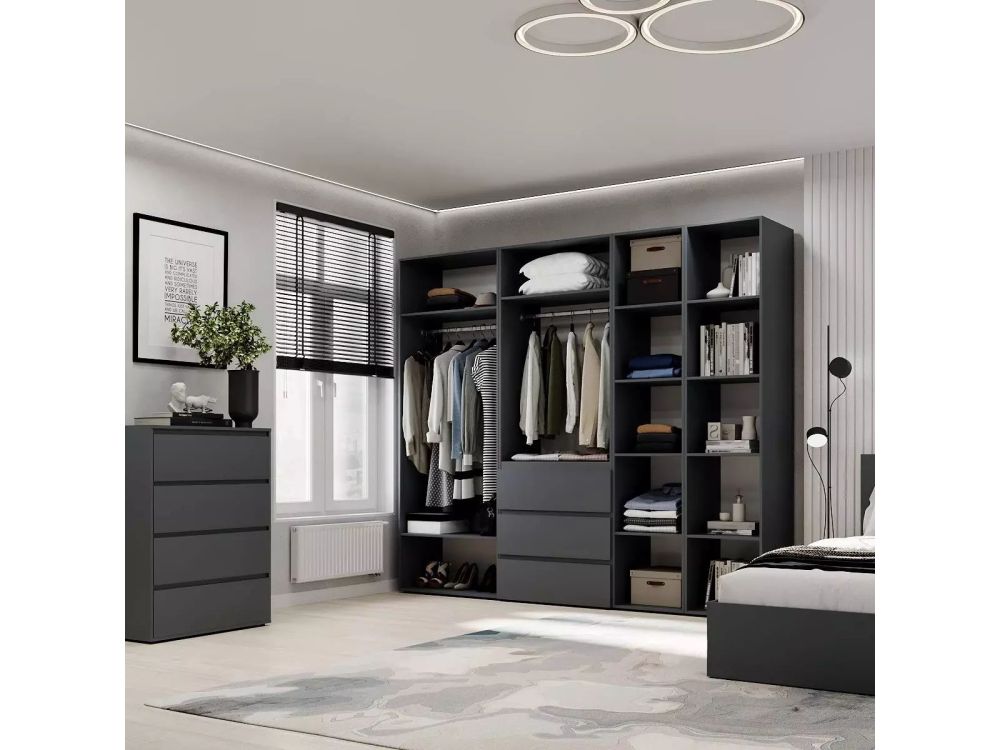 Конструкция данной модели представляет собой комбинацию таких элементов серии: шкаф двухдверный Light 1, шкаф двухдверный с ящиками Light 2, пенал закрытый с полками Light 1 и пенал открытый Light, которые соединяются между собой с помощью специальных болтов. Это очень практично, так как вы сможете выбрать последовательность установки секций для вашего удобства. В вашем распоряжении два отделения с штангой для одежды различной длины, три выдвижных ящика для повседневной одежды и белья, отделение с полками для одежды и открытые полки для книг и элементов декора. Значительная высота шкафа позволяет использовать верхние полки для хранения сезонной одежды, обуви в коробках, одеял или подушек.
