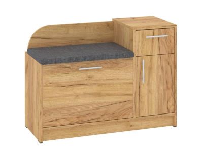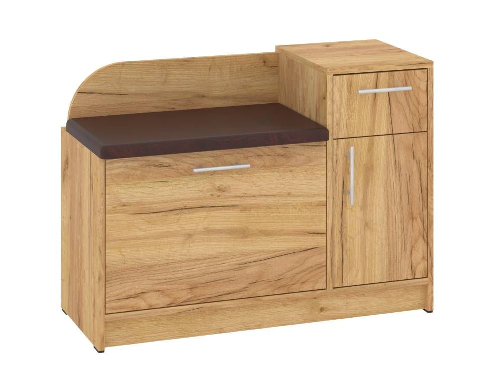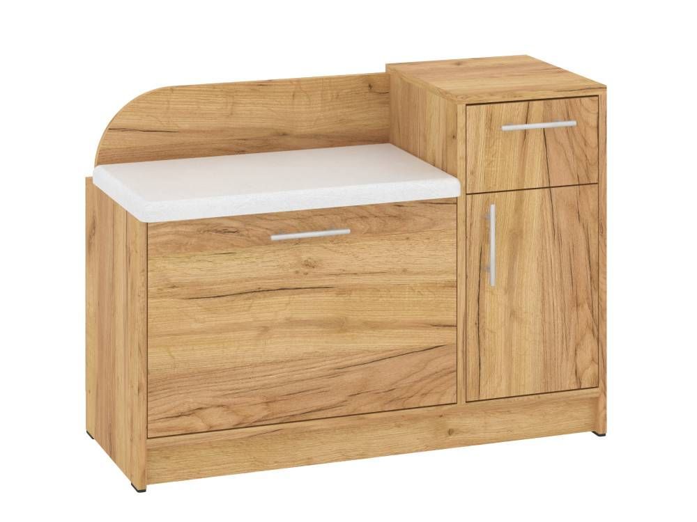 Конструкция тумбы предусматривает мягкое сиденье, закрытое отделение с откидной дверцей, в котором можно удобно разместить несколько пар обуви, а также небольшая тумба с выдвижным ящиком и отделением с распашной дверцей и полочкой внутри. В такой тумбе удобно разместить различные аксессуары, средства по уходу за обувью.