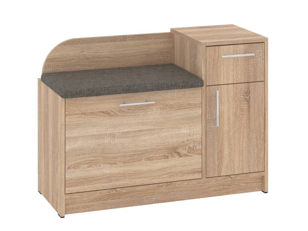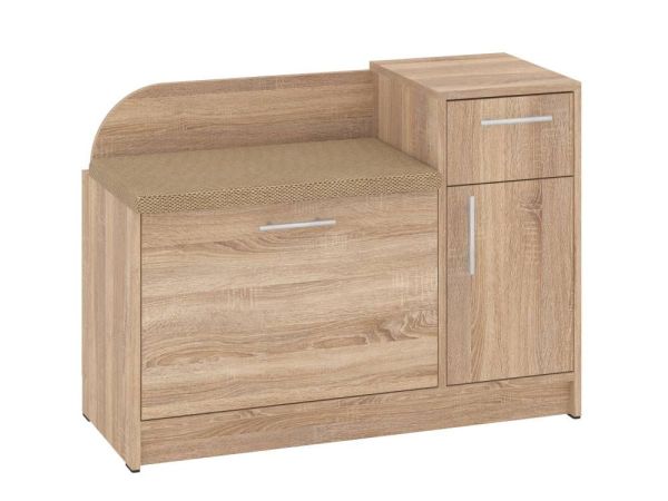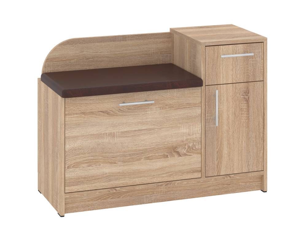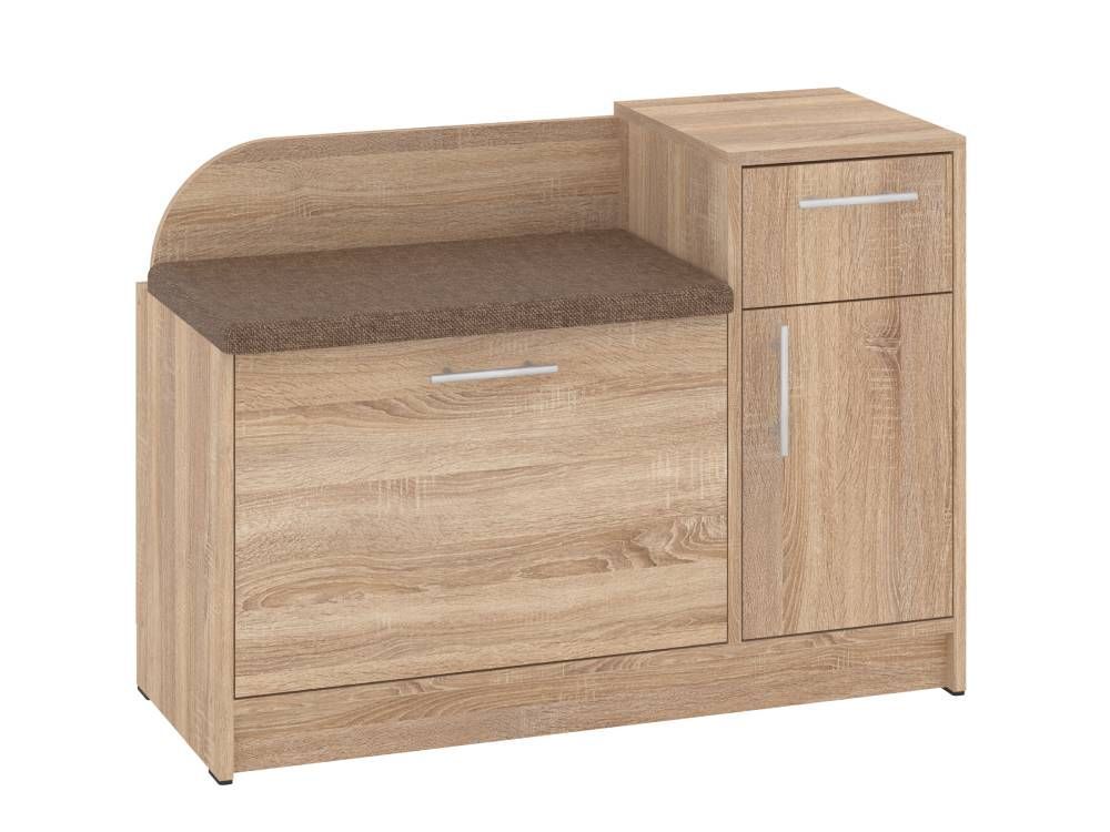 Конструкция тумбы предусматривает мягкое сиденье, закрытое отделение с откидной дверцей, в котором можно удобно разместить несколько пар обуви, а также небольшая тумба с выдвижным ящиком и отделением с распашной дверцей и полочкой внутри. В такой тумбе удобно разместить различные аксессуары, средства по уходу за обувью.