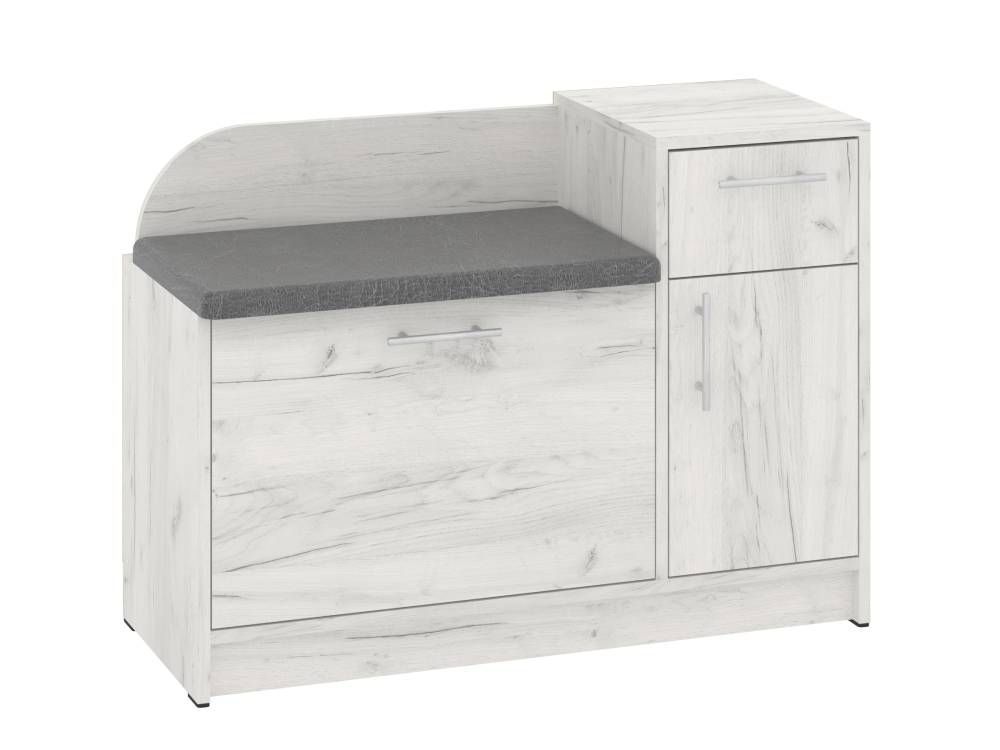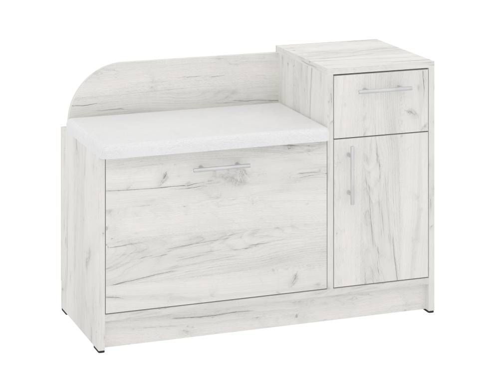 Конструкция тумбы предусматривает мягкое сиденье, закрытое отделение с откидной дверцей, в котором можно удобно разместить несколько пар обуви, а также небольшая тумба с выдвижным ящиком и отделением с распашной дверцей и полочкой внутри. В такой тумбе удобно разместить различные аксессуары, средства по уходу за обувью.