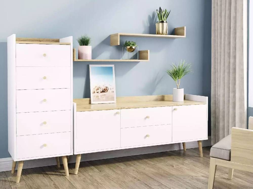 Комод виготовлений із ламінованої ДСП, зносостійкого матеріалу, який чудово зберігає гарний зовнішній вигляд. Використання кромки ПВХ товщиною 2 мм не тільки забезпечує захист торців ДСП від вологи та подряпин, а також м'яко заокруглює кути комода, забезпечуючи захист від випадкових травм. Якісна фурнітура забезпечує плавну роботу механізмів та продовжує термін служби меблів.