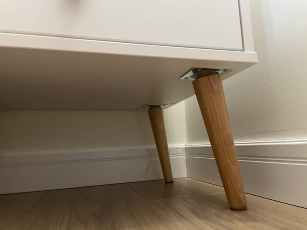 Стійкість моделі забезпечують дерев'яні ніжки, які залишають вільний простір для зручності прибирання, фасади ящиків доповнені круглими дерев'яними ручками, що підтримують загальний стиль комода.