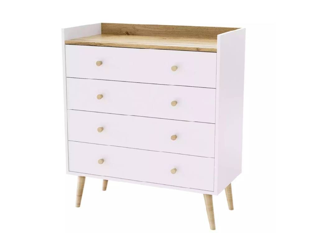 Конструкція комода включає чотири місткі ящики на телескопічних напрямних. Корпус комода трохи виступає над ящиками, утворюючи практичний борт. Така деталь не тільки надає оригінальності, але й робить використання поверхні зручнішою та безпечнішою. Ви зможете розмістити на поверхні комоду косметичні засоби, елементи декору, органайзери з необхідними речами, не побоюючись, що вони зісковзнуть або впадуть на підлогу. Стильним доповненням моделі виступають круглі дерев'яні ручки на фасадах і, звичайно ж, високі дерев'яні ніжки, які візуально полегшують сприйняття комода і залишають вільний доступ для прибирання.