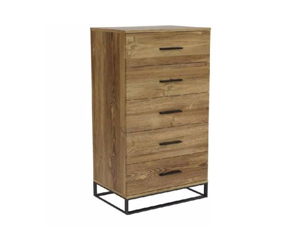 Ця модель складається з п'яти висувних ящиків на телескопічних напрямних. Комод високий і вузький, займає небагато місця, при цьому досить місткий, дозволить зберігати значну кількість речей. Він універсальний і практичний, у його ящиках ви зможете зберігати одяг, аксесуари, документи, різні гаджети та багато іншого. Конструкційна особливість даної моделі - цільнозварна металева основа, на якій стоїть комод. Такий прийом дозволяє візуально полегшити конструкцію, а також залишити вільний доступ для прибирання. Фасади ящиків доповнені вузенькими ручками, підтримуючи загальний стиль комода.