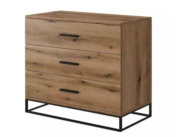 Дана модель складається з трьох висувних ящиків, що зручно та практично для зберігання різних речей, залежно від кімнати, в якій буде стояти комод. У спальні – це може бути одяг для швидкого доступу під рукою, у вітальні – документи, різноманітні аксесуари, побутові дрібниці. Конструкційна особливість комоду - металева основа, яка надає стійкості та надійності, а також залишає вільний простір для прибирання. Фасади ящиків доповнені вузенькими ручками, підтримуючи загальний стиль комода.