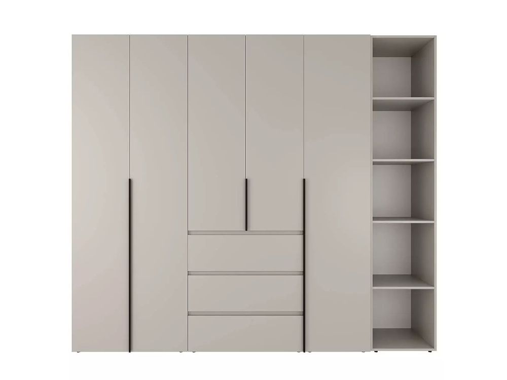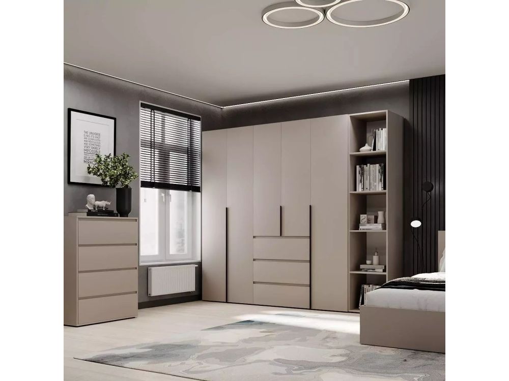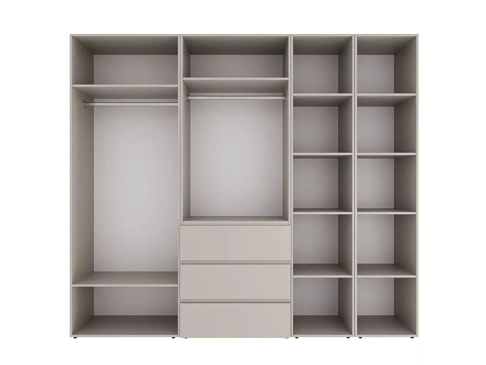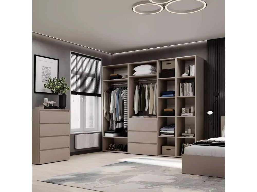 Простора шафа включає кілька відділень з полицями, штангами для одягу та три висувні ящики, доступна для замовлення в декількох популярних відтінках