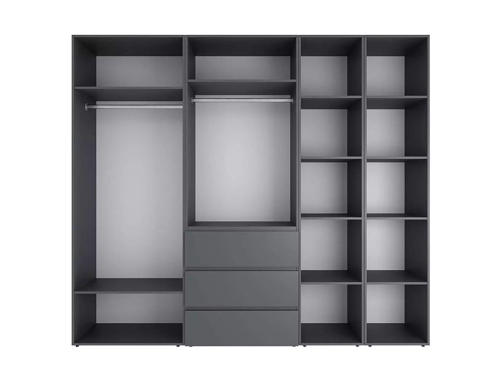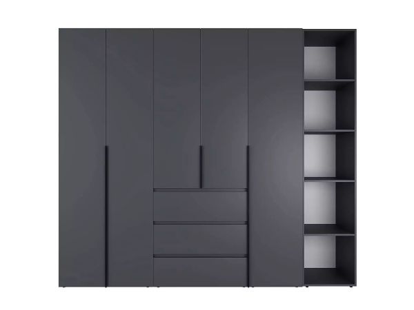 Конструкція даної моделі є комбінацією таких елементів серії: шафа дводверна Light 1, шафа дводверна з ящиками Light 2, пенал закритий з полицями Light 1 і пенал відкритий Light, які з'єднуються між собою за допомогою спеціальних болтів. Це дуже практично, тому що ви зможете вибрати послідовність встановлення секцій для вашої зручності. У вашому розпорядженні два відділення зі штангою для одягу різної довжини, три висувні ящики для повсякденного одягу та білизни, відділення з полицями для одягу та відкриті полиці для книг та елементів декору. Значна висота шафи дозволяє використовувати верхні полиці для зберігання сезонного одягу, взуття в коробках, ковдр чи подушок.