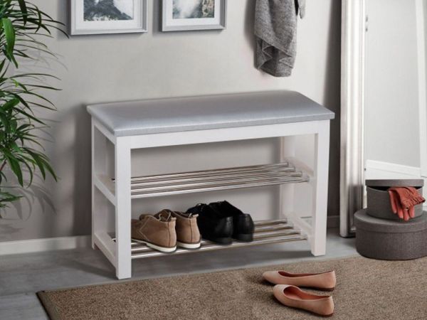 Практичний і сучасний предмет меблів, який стане стильним і функціональним доповненням Вашого передпокою. Лавка досить компактна, не займе багато місця, тому її сміливо можна розміщувати навіть в малогабаритному коридорі. Конструкція виробу передбачає наявність двох металевих полиць і м'якого сидіння зі шкірозамінника для комфортного перевзування.