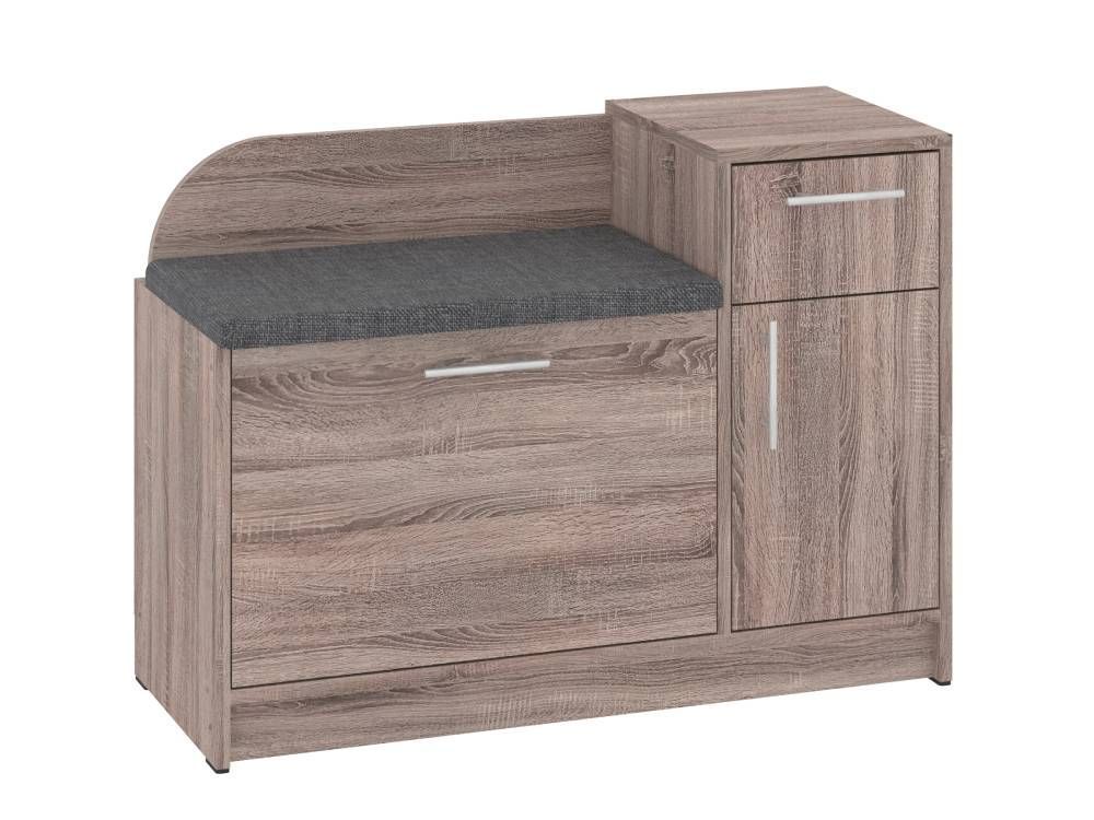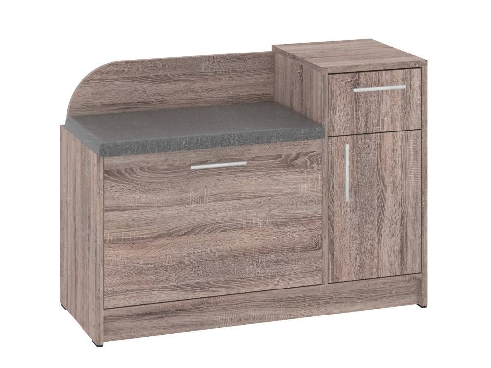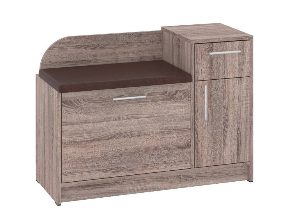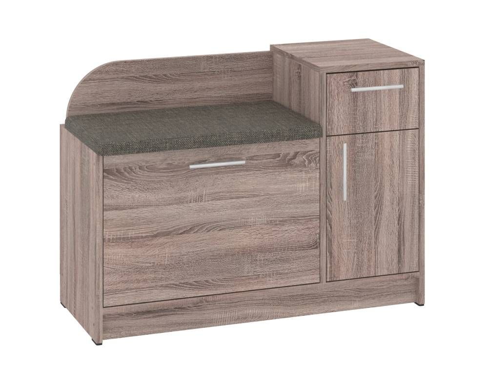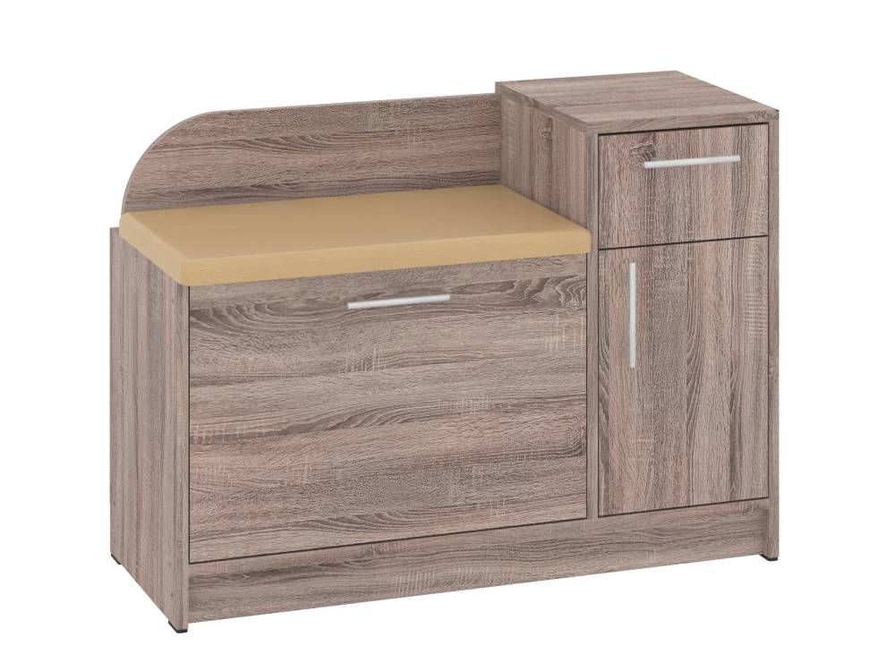 Конструкція тумби передбачає м'яке сидіння, закрите відділення з відкидними дверцятами, в якому можна зручно розмістити кілька пар взуття, а також невелика тумба з висувним ящиком і відділенням з дверцятами, що розстібаються, і поличкою всередині. У такій тумбі зручно розмістити різні аксесуари, засоби догляду за взуттям.
