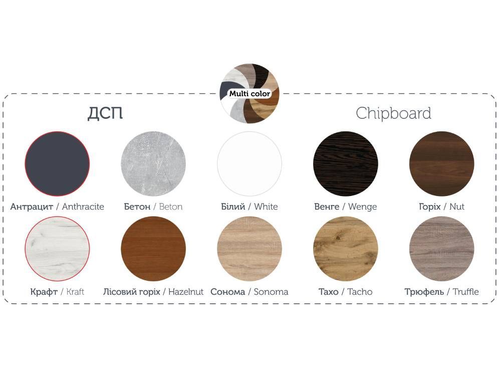 Можливі кольори: бетон, білий, венге, горіх темний, лісовий горіх, сонома, тахо, трюфель, крафт білий, антрацит. Звертаємо вашу увагу, що вартість виробу трохи вища у кольорі "бетон".