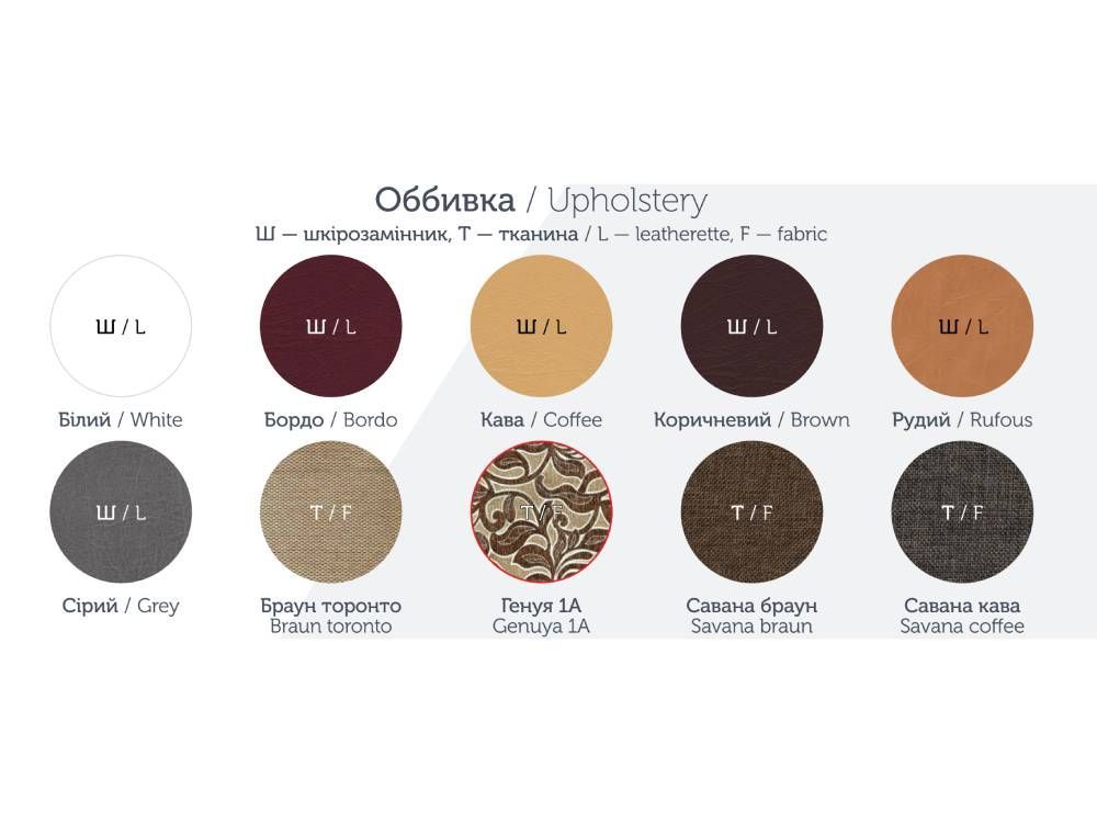 Оббивка шкірозамінника: бордо, кава, коричневий, сірий, рудий, білий.
